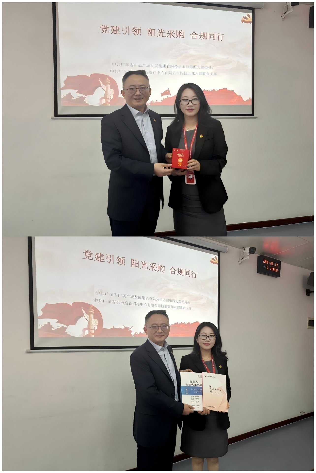 “我为阳光采购献一策”微党课环节亮点纷呈:广晟发展本部第四党支部以《延安时期的采购纪律(1935-1948)》为题,深入探讨了革命战争年代严格的采购制度与纪律,为现代采购工作提供了宝贵的历史参考;招标中心四部五部六部联合支部围绕《招投标知识交流》,系统阐述招投标的基本概念、法律法规体系、招标范围方式及程序要点等关键内容。警示教育环节组织观看了招标领域腐败案例警示教育片《反腐为了人民》第四集,以案明纪强化廉洁意识。随后,双方就如何高效阳光采购等方面进行了深入的交流。针对广晟发展提出的采购流程优化等问题,招标中心业务骨干给予了详尽的解答。